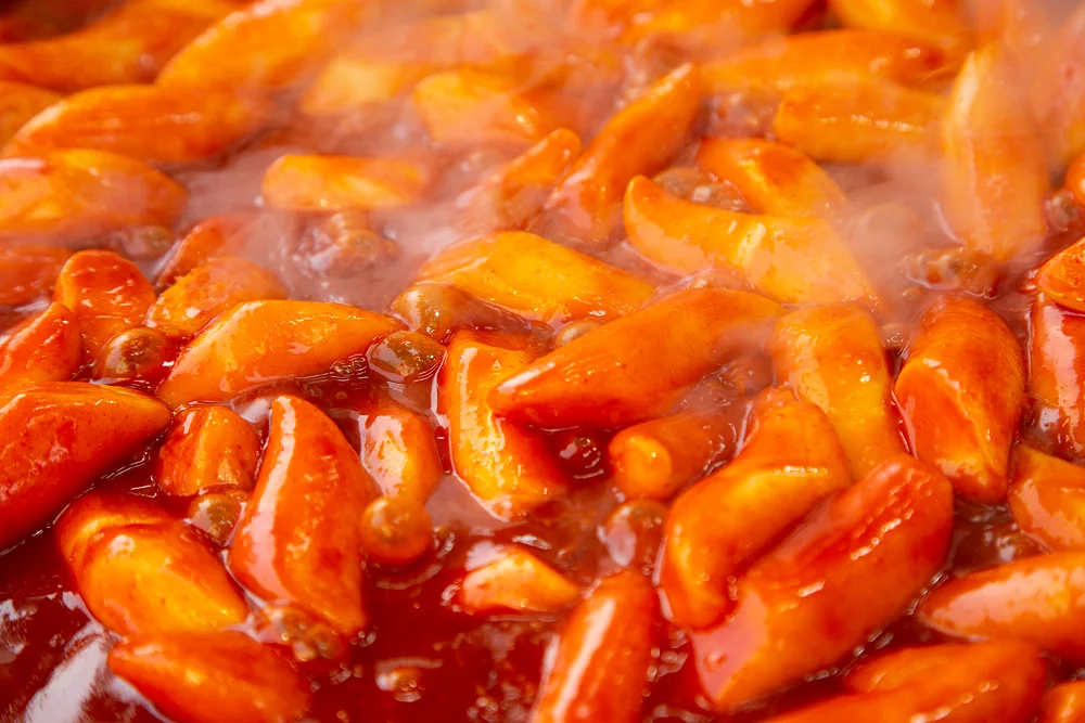 The dominant taste experience is sweet-spicy, characteristic of Korean gochujang-based dishes. The sweetness comes from rice syrup (corn syrup in modern versions) added to the tteokbokki sauce, creating candy-like overtones that balance the chili heat. Underneath, you’ll detect salty-savory umami from the fermented gochujang and anchovy-based stock, plus subtle smokiness from the gochugaru (chili flakes) in the paste.