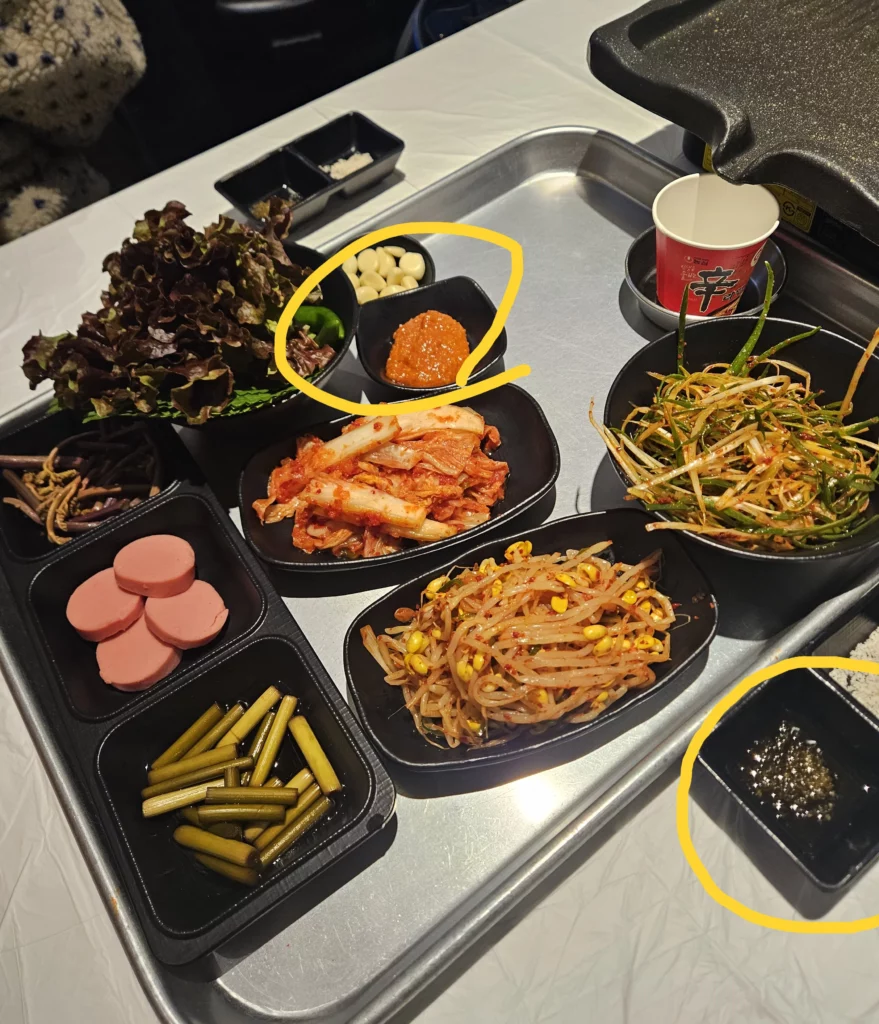 Beyond the star attraction, Gyeongbok provides an array of side dishes (banchan, 반찬) designed to be grilled alongside the samgyeopsal, creating a dynamic, interactive meal where you control every element.