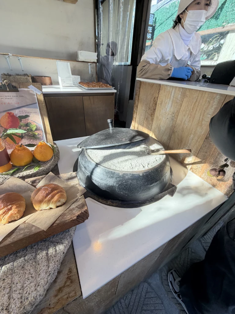 Second, the Ikseon-dong location benefits from the neighborhood’s unique character. Unlike the industrial-chic vibe of Seongsu or the upscale polish of Dosan, Ikseon-dong attracts visitors specifically seeking authentic Korean experiences. The narrow alleyways lined with traditional wooden houses create a nostalgic atmosphere that perfectly complements the artisan approach to salt bread making. Visitors naturally gravitate toward Jayeondo as part of their Ikseon-dong exploration, similar to how hanok cafes like Cafe Onion Anguk have become destination spots by blending traditional architecture with modern cafe culture.