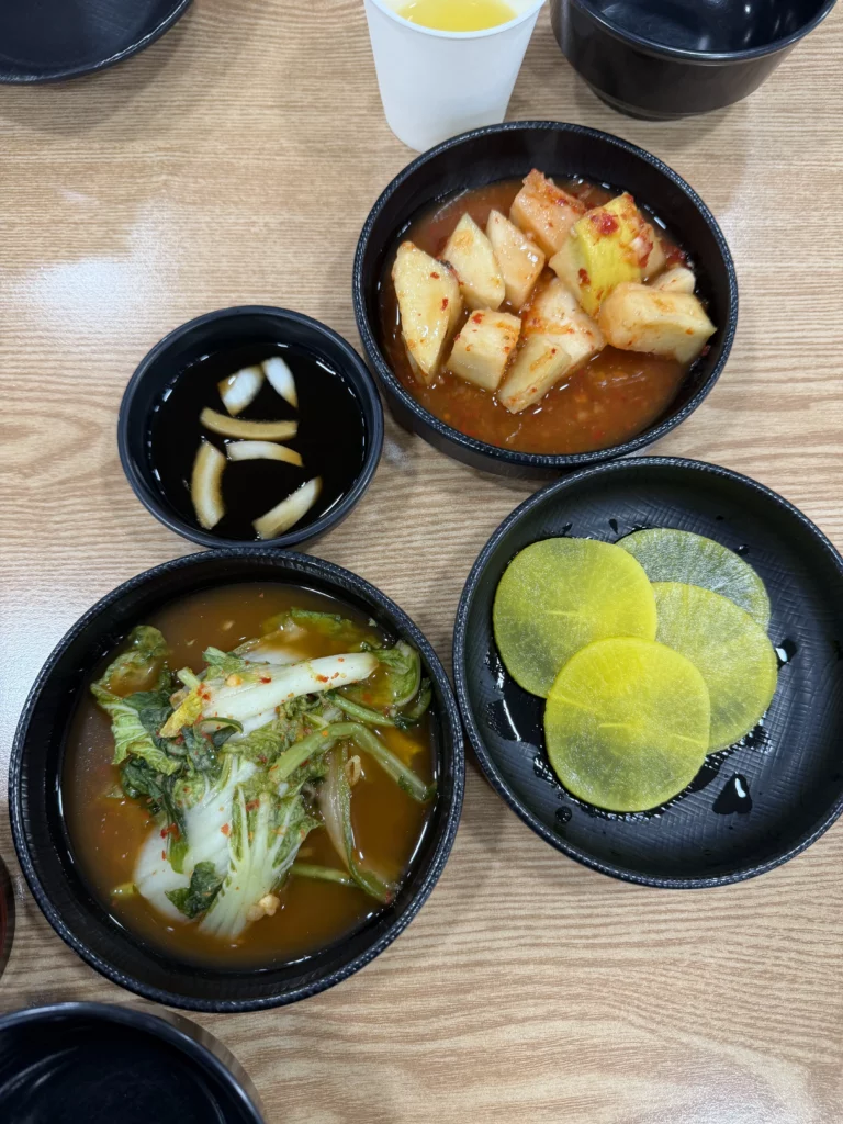 The cold noodles come with generous accompaniments: a pitcher of extra chilled broth for adjusting soup quantity, and notably, the aged kimchi served alongside isn’t decorative. Korean diners add it directly to their noodle bowl, the fermented vegetables enhancing broth complexity while adding crunch and heat.