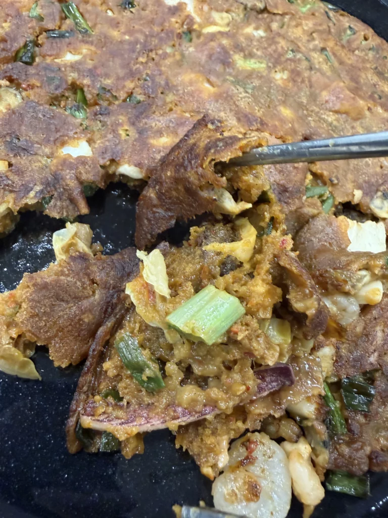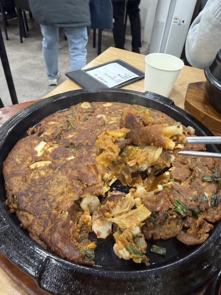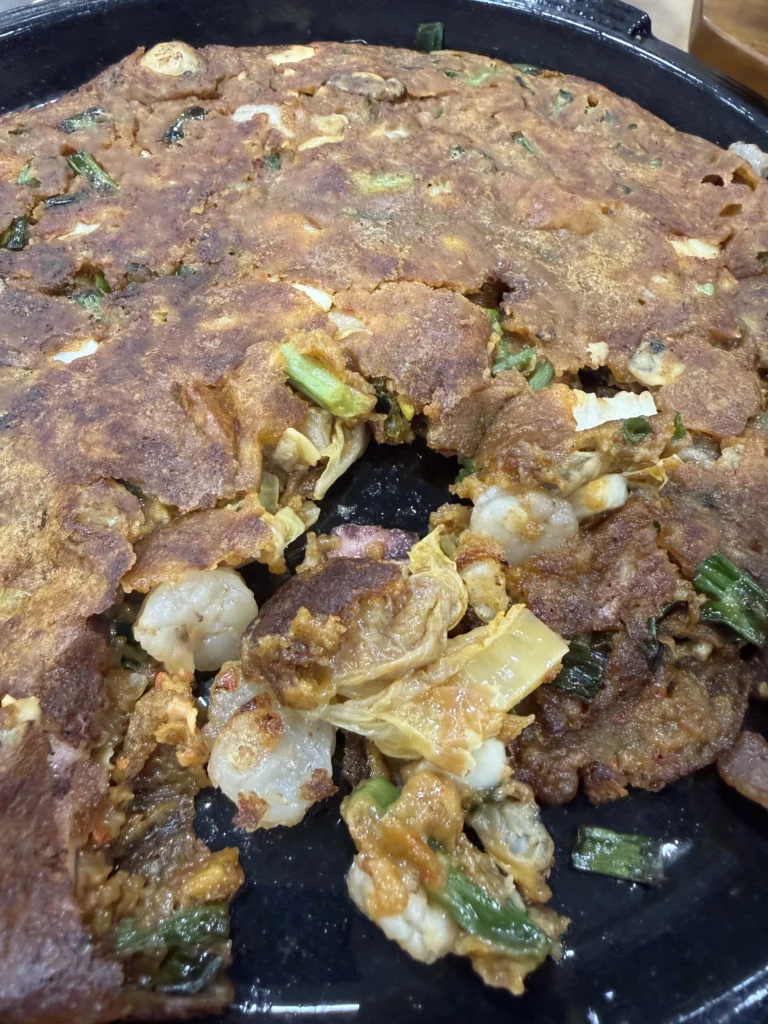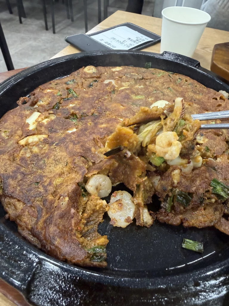 Among the day’s discoveries, memil kimchi jeon (메밀김치전) revealed how buckwheat transforms Korea’s beloved kimchi pancake tradition. Unlike typical wheat-flour versions, buckwheat creates delicate, lacy texture with exceptionally crispy edges and lighter, almost fritter-like interior.