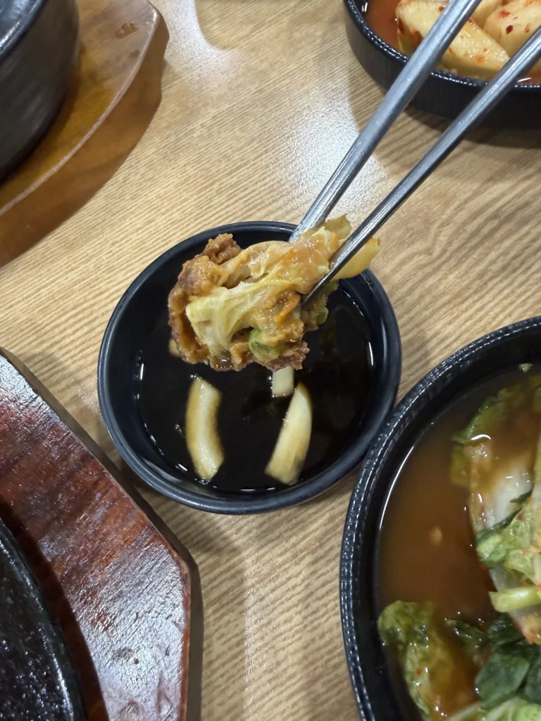 What distinguished this preparation was buckwheat’s subtle mineral notes complementing the kimchi’s funky complexity. The gluten-free batter produced lighter texture compared to chewy wheat-flour pancakes, while properly aged kimchi contributed developed sourness and umami depth. No dipping sauce needed—the pancake contained sufficient seasoning from kimchi and batter.