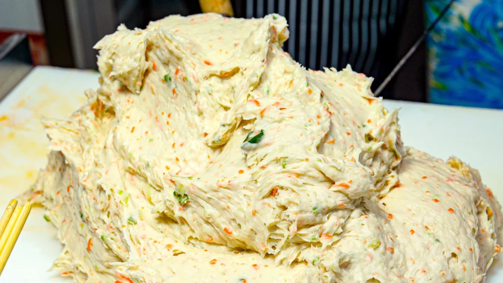What distinguishes Song’s approach from commercial fish cake production is his unwavering commitment to quality ingredients. While most factory-produced eomuk contains 50-60% fish content padded with flour and starches, Song uses premium sea bream (domi, 도미) as his primary ingredient with minimal flour addition. This results in fish cakes with superior bounce and a clean, authentic seafood flavor that commercial products simply cannot replicate.