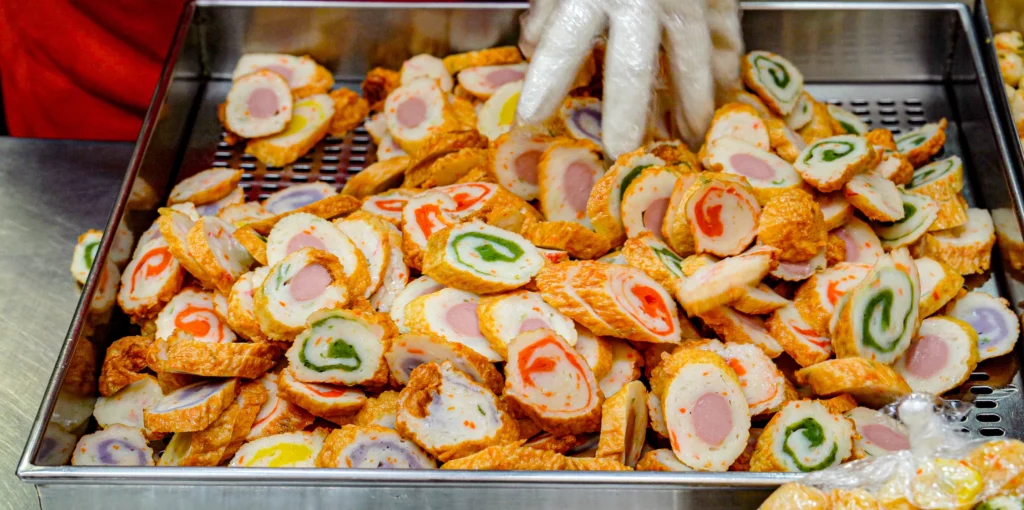 Proper Eating Method Fish cakes purchased here are meant to be eaten immediately while hot. The skewered hot-bar varieties are designed for walking and eating—simply hold the stick and bite directly, savoring the contrast between the crispy exterior and bouncy interior. For packaged varieties intended for home cooking, brief reheating in an air fryer (180°C for 5 minutes) or pan-frying revives the texture beautifully.