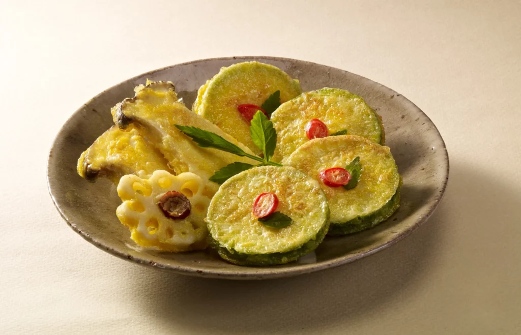 Mild and soft flavor that balances the platter. Light green zucchini coated in golden egg batter is visually beautiful too. Its moisture creates a crispy yet moist texture.